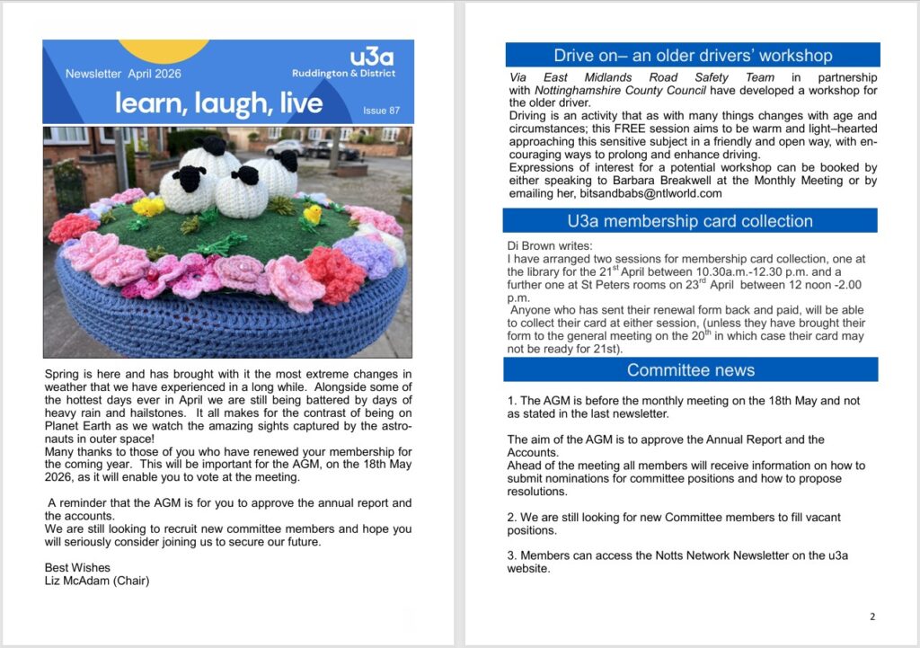 Our newsletters are sent out monthly and hold information about Ruddington and District Group. An electronic version of the latest newsletter has been sent to the known e-mail addresses of all members and is available to download here April 2026 Newsletter.